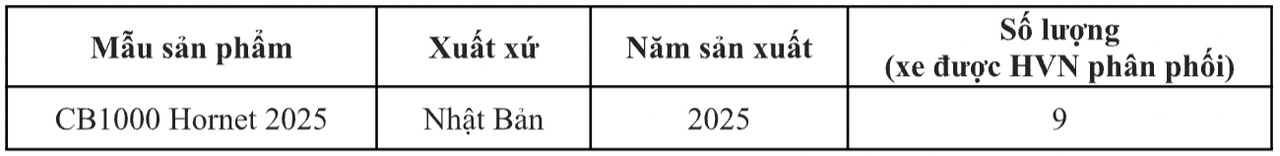 Công ty Honda Việt Nam (HVN) thông báo bắt đầu thực hiện chiến dịch triệu hồi mẫu xe CB1000 Hornet 2025 (“Sản phẩm”), nhập khẩu trực tiếp từ Nhật Bản, được phân phối chính hãng thông qua Cửa hàng xe Phân khối lớn Honda DreamWing, để thay thế phụ tùng, nhằm đảm bảo chất lượng tối ưu cho sản phẩm. Cho đến hiện nay chưa ghi nhận trường hợp nào ảnh hưởng đến vận hành hoặc an toàn của xe.