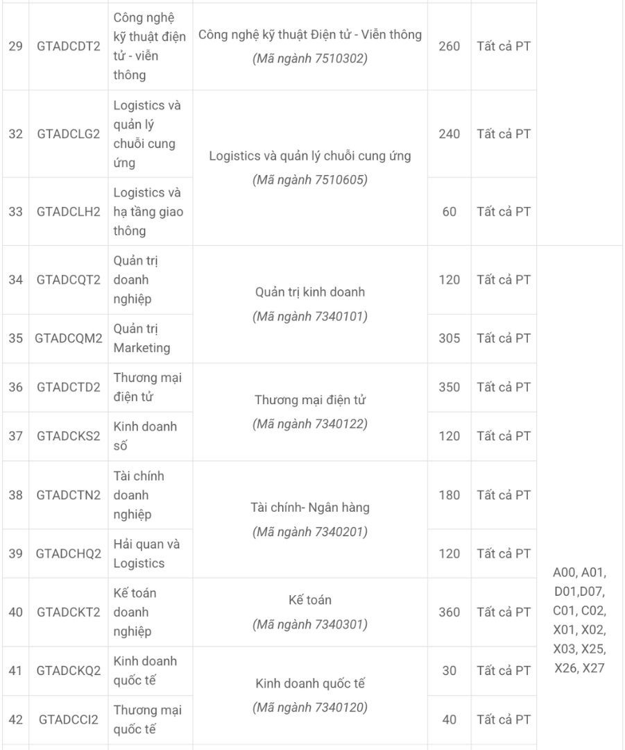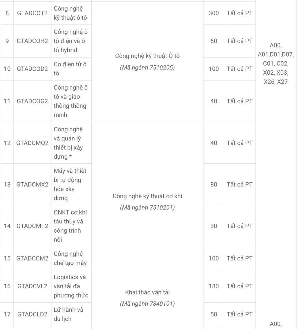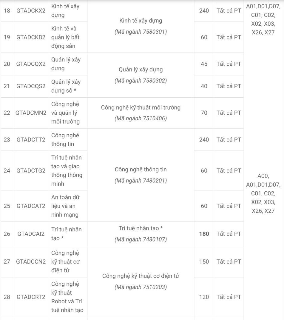 Các ngành đào tạo và chỉ tiêu tuyển sinh năm 2026 của Trường Đại học Công nghệ Giao thông vận tải, trong đó có ngành Công nghệ thông tin. Ảnh: Trường Đại học Công nghệ Giao thông vận tải