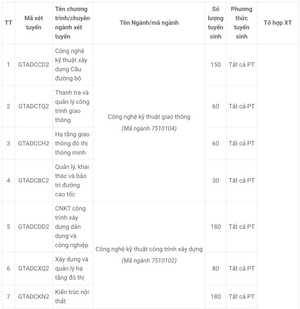 Đối với Trường Đại học Công nghệ Giao thông vận tải, một số ngành đào tạo xét tuyển bằng tổ hợp D07 (Toán, Hóa, tiếng Anh) như: Công nghệ kỹ thuật giao thông, Công nghệ kỹ thuật công trình xây dựng, Công nghệ kỹ thuật ô tô, Công nghệ kỹ thuật cơ khí, Kinh tế xây dựng, Công nghệ kỹ thuật môi trường, Công nghệ kỹ thuật cơ điện tử, Công nghệ thông tin...