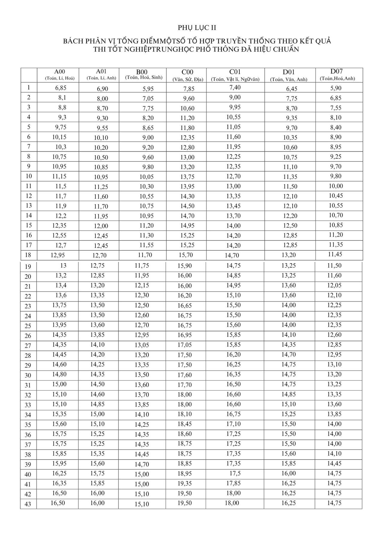Bách phân vị tổng điểm một số tổ hợp truyền thống theo kết quả thi tốt nghiệp THPT đã hiệu chuẩn: