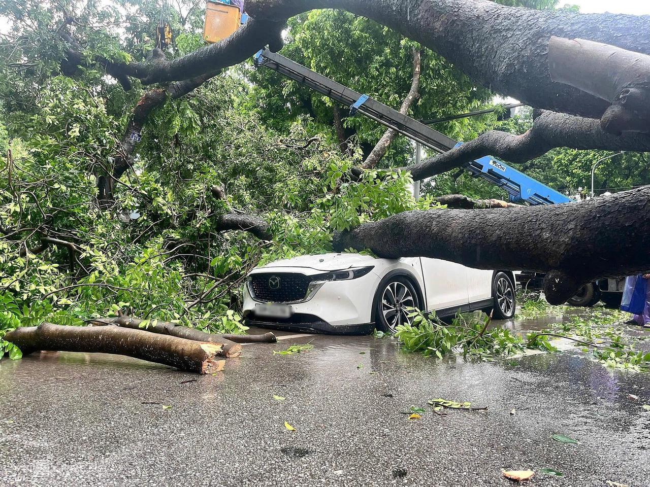 Cây lớn bật gốc, ngã đè lên ô tô đi đường giữa phố Hà Nội
