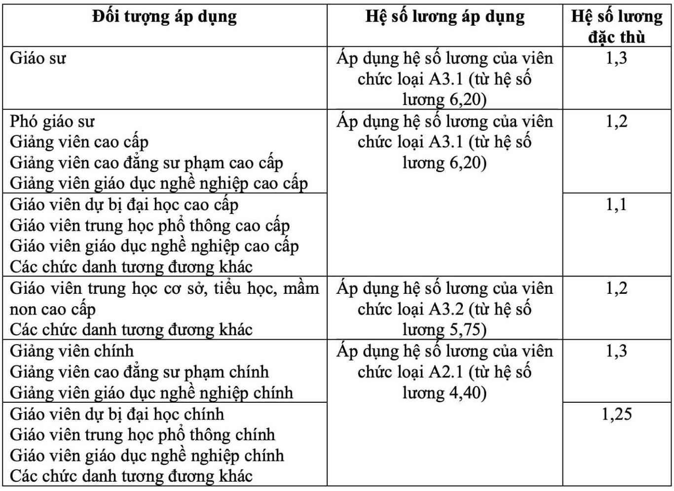 Phó giáo sư, Giảng viên cao cấp, Giảng viên cao đẳng sư phạm cao cấp, Giảng viên giáo dục nghề nghiệp cao cấp: Áp dụng hệ số lương của viên chức loại A3.1 (từ hệ số lương 6,20); Hệ số lương đặc thù 1,2