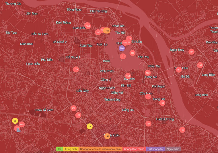 Các điểm có chỉ số ô nhiễm ở ngưỡng đỏ như Từ Hoa AQI 169, Trần Hưng Đạo AQI 158, Lê Duẩn AQI 170.