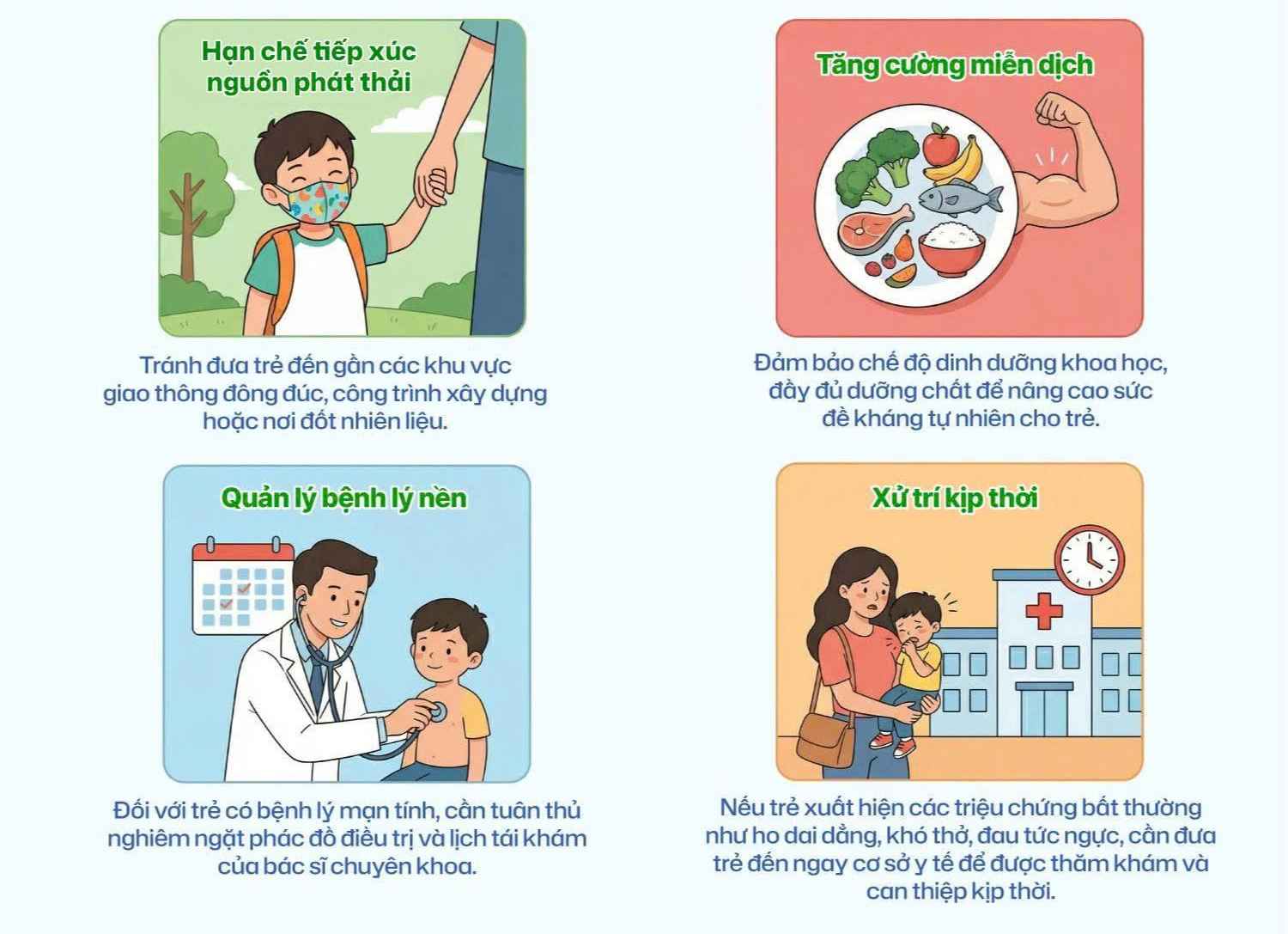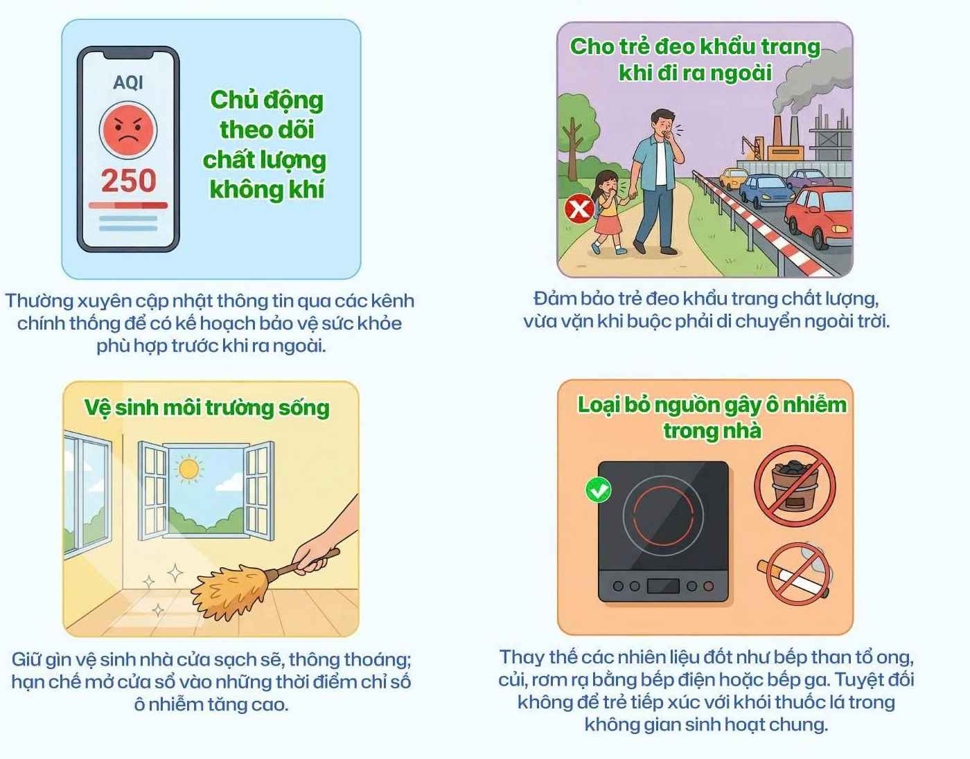 Người dân cần đeo khẩu trang đạt chuẩn khi ra ngoài, vệ sinh nhà cửa thông thoáng, hạn chế nguồn khói bụi trong sinh hoạt, trồng cây xanh, tránh khói thuốc lá và theo dõi sức khỏe định kỳ. Nhóm nhạy cảm như trẻ em, người già, phụ nữ mang thai, người mắc bệnh hô hấp – tim mạch cần hạn chế ra ngoài khi không khí ô nhiễm, tránh khu vực nhiều khói bụi và đi khám ngay khi xuất hiện triệu chứng bất thường.