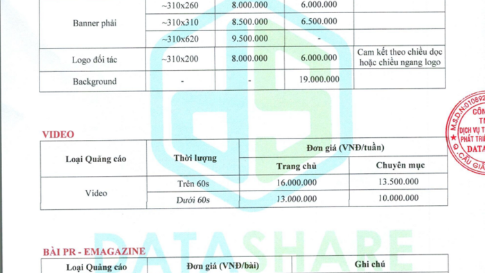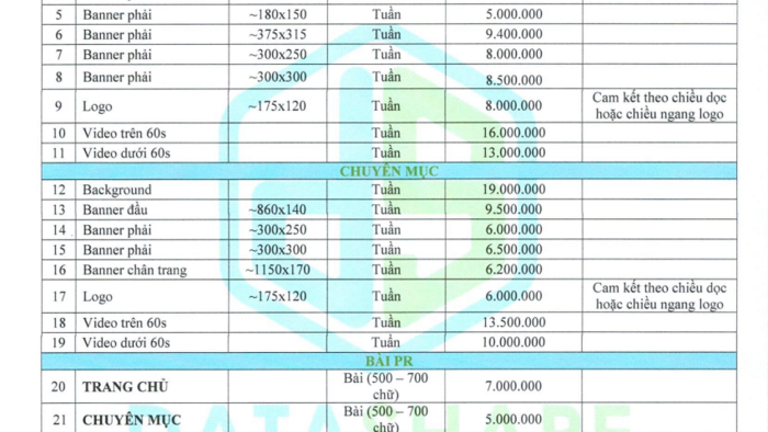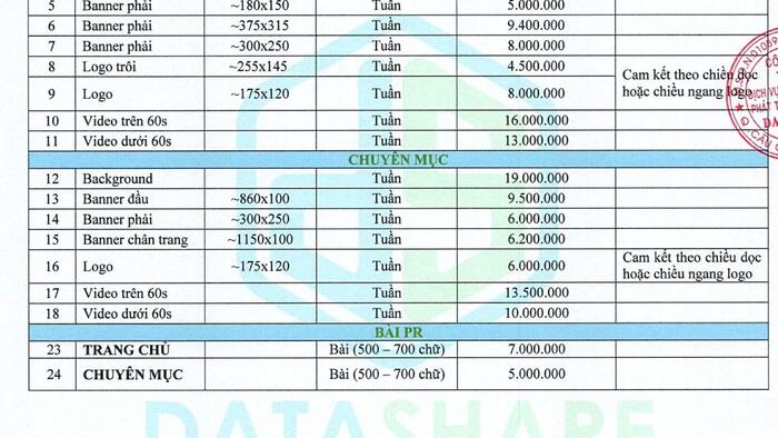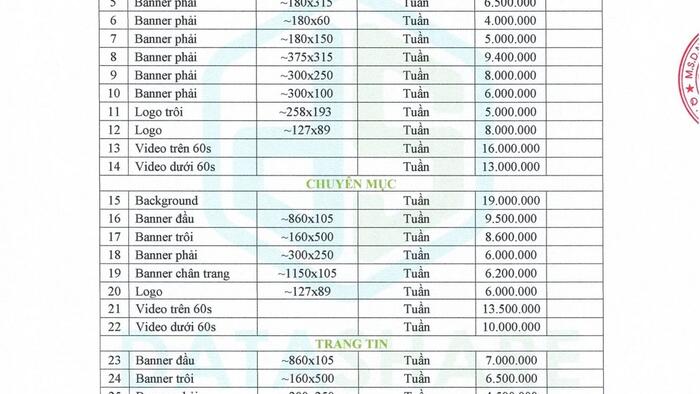 Xin gửi tới quý khách hàng bảng báo giá quảng cáo trên trang tin