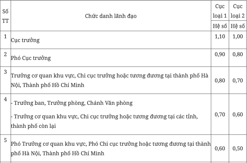 Hệ số phụ cấp chức vụ lãnh đạo của Cục thuộc Bộ
