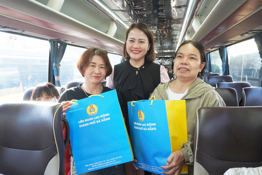 Tại điểm xuất phát, bà Trần Thị Mẫn - Phó Chủ tịch Ủy ban MTTQ Việt Nam TP Đà Nẵng cùng bà Phan Thị Thúy Linh - Chủ tịch Liên đoàn Lao động thành phố Đà Nẵng, đã trực tiếp thăm hỏi, chúc Tết và trao quà cho công nhân, người lao động trước giờ khởi hành về quê đón Tết, thể hiện sự quan tâm, sẻ chia kịp thời của các cấp đối với đoàn viên, người lao động xa quê.