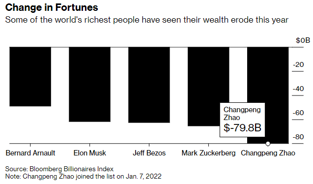 Đáng chú ý, Changpeng Zhao – tỷ phú tiền ảo vừa xuất hiện trong chỉ số tỷ phú của Bloomberg hồi tháng 1/2022 – chứng kiến tài sản bốc hơi gần 80 tỷ USD từ đầu năm 2022 giữa lúc thị trường tiền ảo lao dốc không phanh.