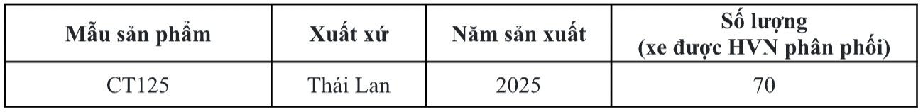 Công ty Honda Việt Nam (HVN) thông báo bắt đầu thực hiện chiến dịch triệu hồi mẫu xe CT125 2025 (“Sản phẩm”), nhập khẩu trực tiếp từ Thái Lan, được phân phối chính hãng thông qua Cửa Hàng Bán Xe Máy Và Dịch Vụ Do Honda Ủy Nhiệm (HEAD), để thay thế phụ tùng, nhằm đảm bảo chất lượng tối ưu cho sản phẩm. Cho đến hiện nay chưa ghi nhận trường hợp nào ảnh hưởng đến vận hành hoặc an toàn của xe.