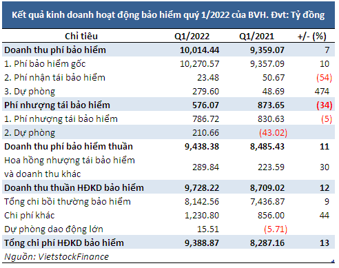 Trong hoạt động kinh doanh bảo hiểm, BVH ghi nhận doanh thu phí bảo hiểm gốc hơn 10,014 tỷ đồng, tăng 7% so với cùng kỳ năm trước. Trong khi đó, chi phí nhượng tái bảo hiểm giảm 34%, còn gần 576 tỷ đồng, nên doanh thu bảo hiểm thuần tăng 11%, đạt hơn 9,438 tỷ đồng .