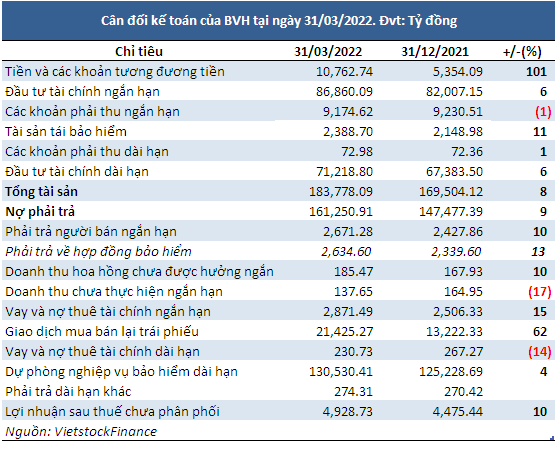 Tổng tài sản của BVH tính đến cuối quý 1 đạt hơn 183,778 tỷ đồng, tăng 8% so với đầu năm. Trong đó, tiền và các khoản tương đương tiền tăng mạnh, gấp 2.1 lần đầu năm, lên gần 10,763 tỷ đồng. Đầu tư tài chính ngắn hạn và dài hạn cùng tăng 6%, lần lượt lên hơn 86,860 tỷ đồng và 71,218 tỷ đồng.