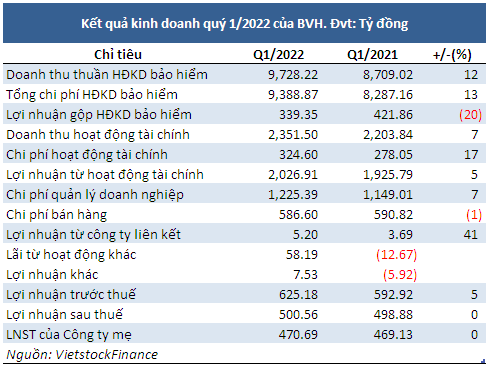 Hoạt động kinh doanh bảo hiểm có lợi nhuận giảm 20%, trong khi lợi nhuận đầu tư tài chính chỉ tăng nhẹ 5% khiến lợi nhuận ròng của Tập đoàn Bảo Việt (HOSE: BVH) “giậm chân tại chỗ” trong quý 1/2022.