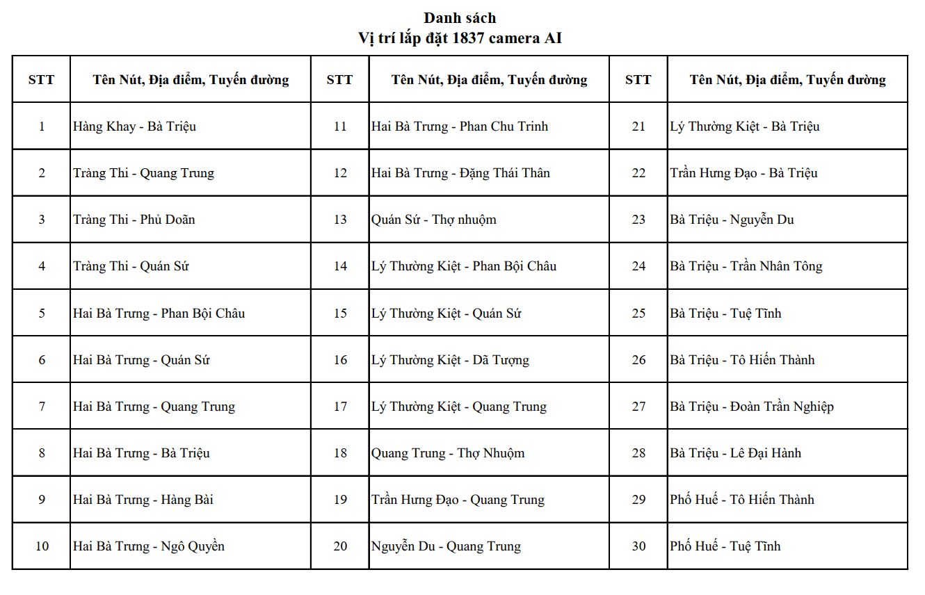 Thông tin từ Công an TP Hà Nội, nhằm nâng cao ý thức chấp hành pháp luật của người dân, với tinh thần công khai, minh bạch, Công an TP Hà Nội thông báo các vị trí lắp đặt 1.837 camera AI phục vụ xử lý vi phạm trong lĩnh vực trật tự, an toàn giao thông, trật tự đô thị, trật tự công cộng, như sau: