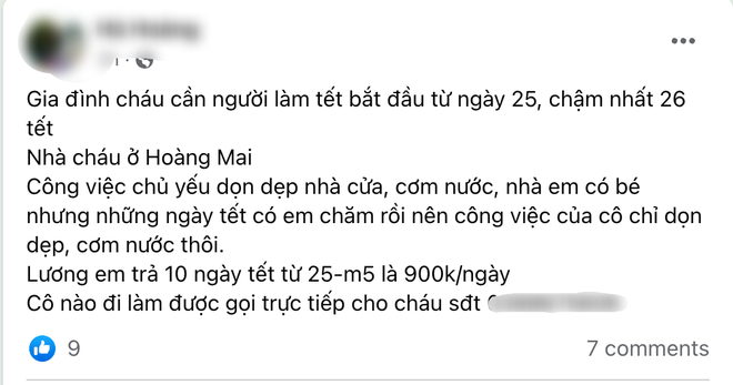 Chị H.H cũng đăng tải thông tin tìm người giúp việc ở lại trong 10 ngày Tết từ 25 Âm lịch đến mùng 5 Âm lịch với mức lương 900.000 đồng/ngày. Các công việc cụ thể cũng được chị liệt kê chủ yếu dọn dẹp nhà cửa, cơm nước, nhà em có bé nhưng những ngày Tết có bố mẹ chăm.