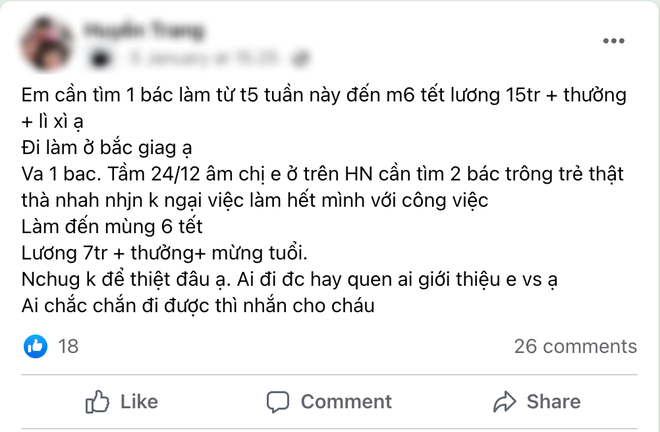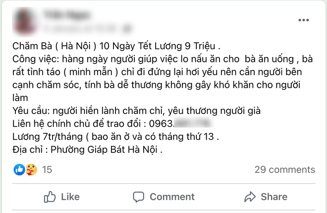 Nhiều gia đình đăng tuyển giúp việc 10 ngày Tết với mức lương hấp dẫn.