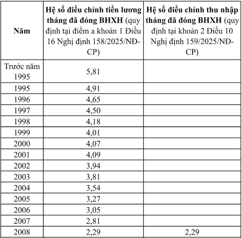 Theo đó, căn cứ hướng dẫn tại điểm a khoản 1 Điều 16 Nghị định số 158/2025/NĐ-CP ngày 25.6.2025 của Chính phủ và khoản 2 Điều 10 Nghị định số 159/2025/NĐ-CP ngày 25.6.2025 của Chính phủ về công thức xác định hệ số điều chỉnh tiền lương, thu nhập tháng đã đóng BHXH;