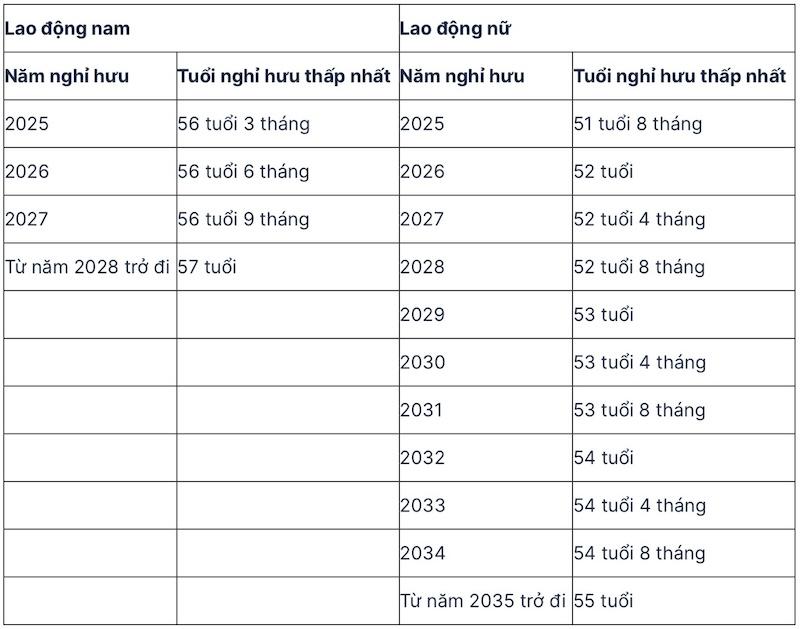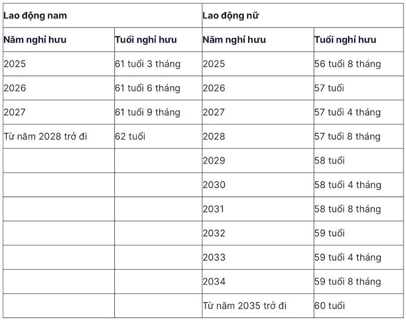 Năm 2025, độ tuổi nghỉ hưu của người lao động nam sẽ là 61 tuổi 3 tháng, lao động nữ sẽ là 56 tuổi 8 tháng; năm 2026, độ tuổi nghỉ hưu của người lao động nam sẽ là 61 tuổi 6 tháng, lao động nữ sẽ là 57 tuổi;...