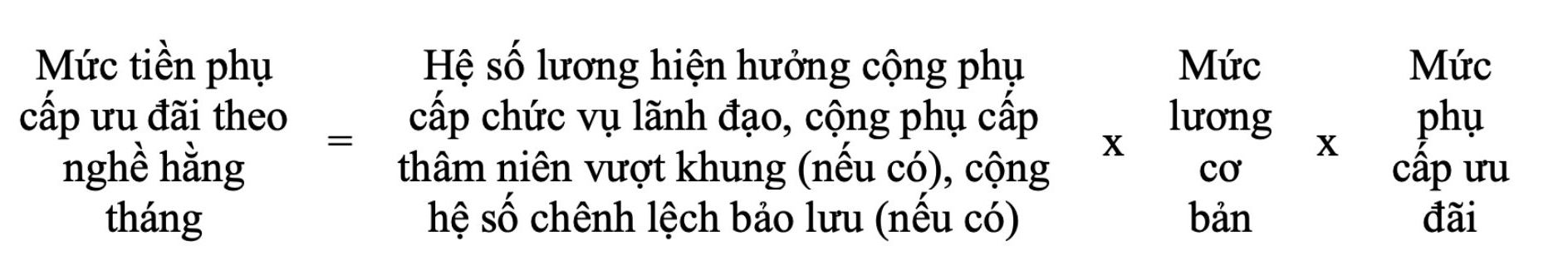 Ngoài ra, Khoản 2 Điều 8 dự thảo Nghị định quy định công thức tính mức tiền phụ cấp ưu đãi nghề hằng tháng như sau: