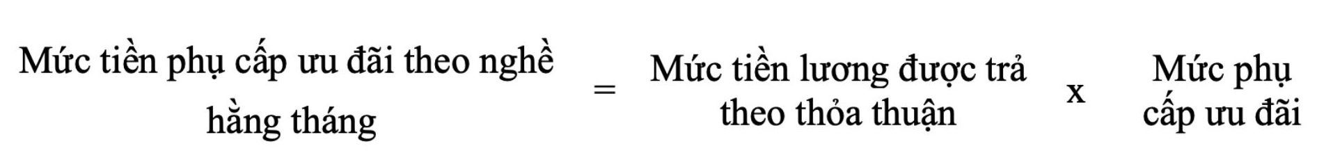 Mức tiền phụ cấp ưu đãi theo nghề trong tháng = (Mức tiền phụ cấp ưu đãi theo nghề hằng tháng / 22 ngày (số ngày làm việc tiêu chuẩn trong 01 tháng)) x Số ngày được tính hưởng phụ cấp trong tháng.