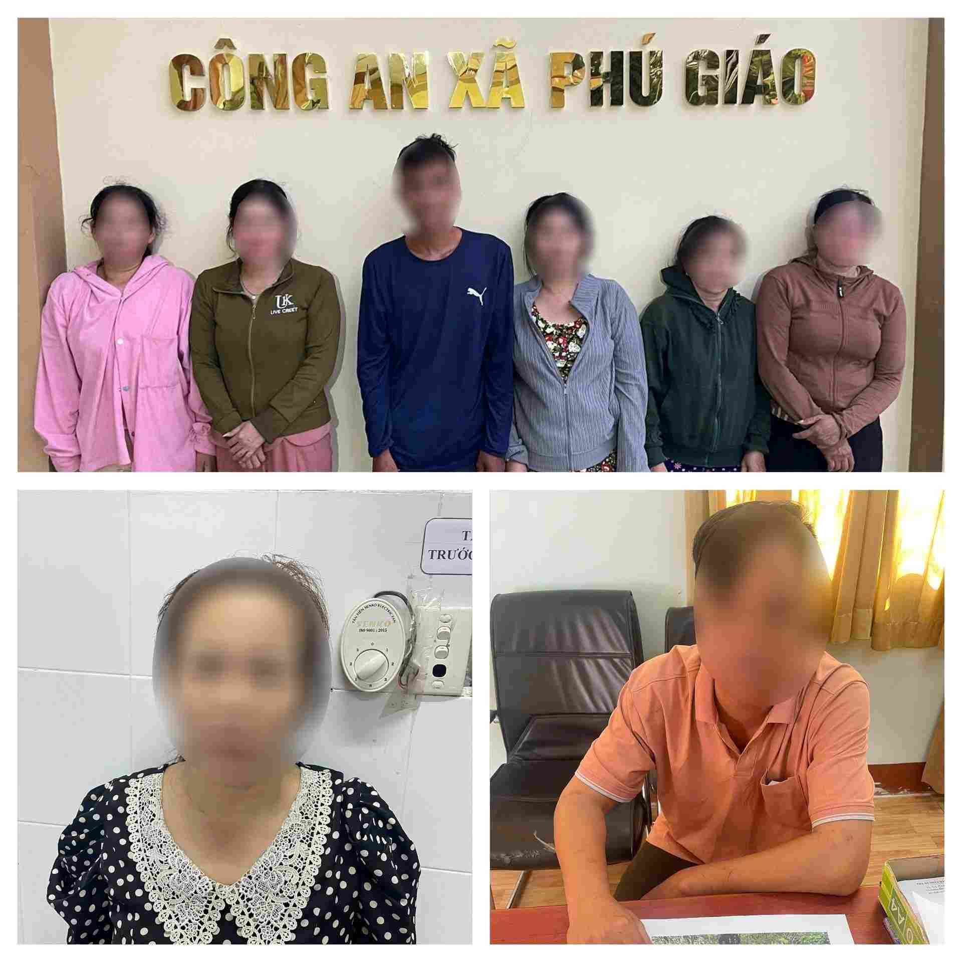 Các đối tượng bị bắt, trong đó có 6 phụ nữ và 2 nam giới gồm: Nguyễn Thị Thúy (sinh năm 1982), Lê Thị Kim Ngọc (sinh năm 1988, lao động tự do), Nguyễn Thị Ngọc Điệp (sinh năm 1970), Phạm Thị Minh Hải (sinh năm 1984, nội trợ), Nguyễn Thị Ngọc Điểm (sinh năm 1990, lao động tự do), Huỳnh Thị Thủy (sinh năm 1973, lao động tự do), Phạm Văn Phúc (sinh năm 1994, làm thuê), Nguyễn Văn Triệu (sinh năm 1985, bảo vệ).