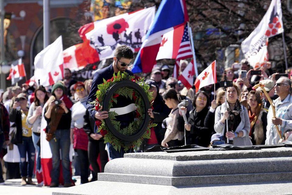 Hàng trăm người biểu tình đã tập trung tại Đài tưởng niệm Chiến tranh Quốc gia Canada - tâm điểm trong những ngày đầu của cuộc biểu tình trước đó vào tháng 2. Trong ảnh, cựu chiến binh Christopher Deering đặt vòng hoa trên lăng mộ của Người lính vô danh trong một buổi lễ tưởng nhớ.