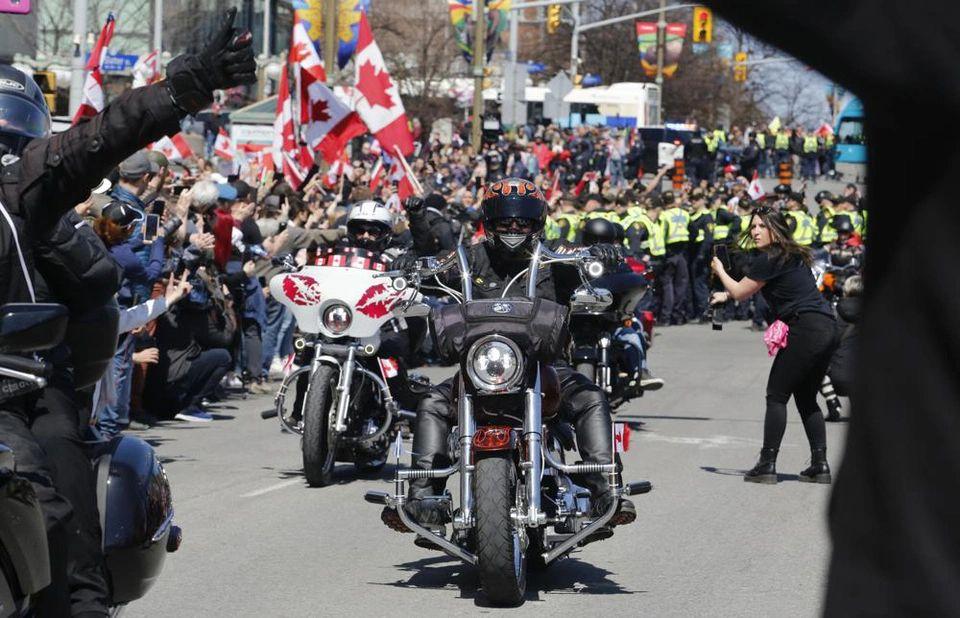 Xe máy chạy ầm ầm trên đường phố thủ đô Canada hôm 30/4 trong cuộc biểu tình "Rolling Thunder" ngay dưới sự giám sát của cảnh sát.