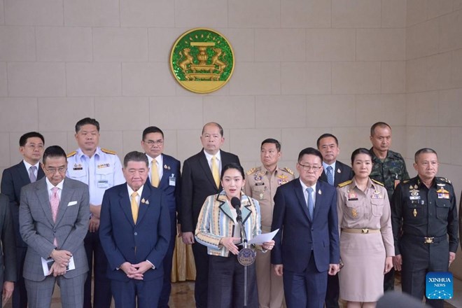 Thủ tướng Thái Lan Paetongtarn Shinawatra (thứ 3 từ trái, hàng trước) thông báo về việc kiểm soát biên giới với Campuchia, ngày 23.6.2025. Ảnh: Xinhua