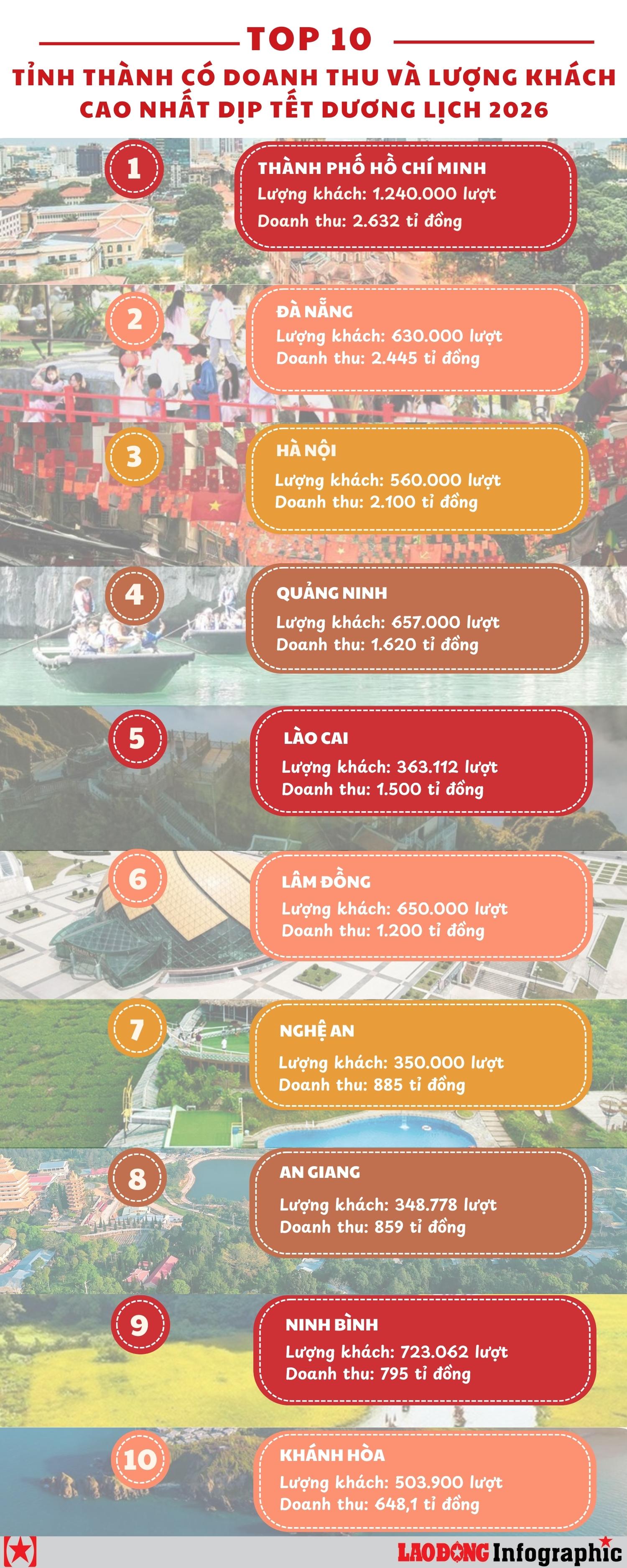 TP Hồ Chí Minh, Hà Nội, Quảng Ninh, Đà Nẵng... là các tỉnh thành có lượng khách du lịch và doanh thu cao nhất trong 4 ngày nghỉ Tết Dương lịch 2026.