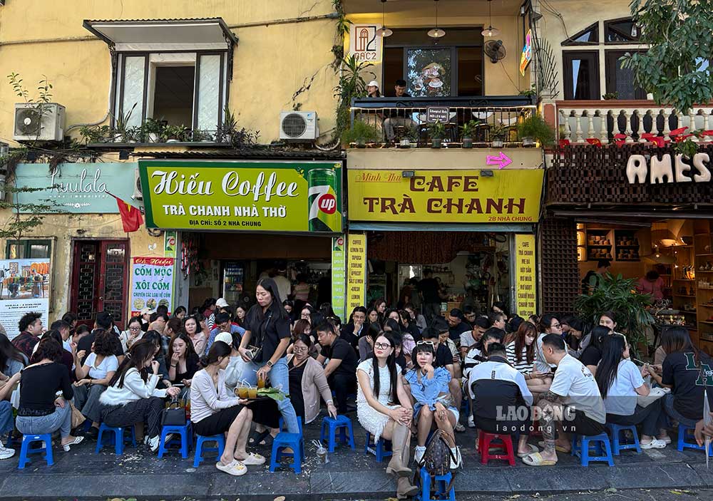 Vào những ngày giữa tuần bận rộn, tưởng chừng như Nhà thờ Lớn Hà Nội sẽ vắng vẻ. Nhưng khi không khí lạnh tràn về, trời xanh nắng vàng trở lại trên bầu trời Hà Nội, tấp nập du khách và các bạn trẻ đến đây check-in, chụp ảnh và thưởng thức cốm mộc, xôi cốm, cốm xào...