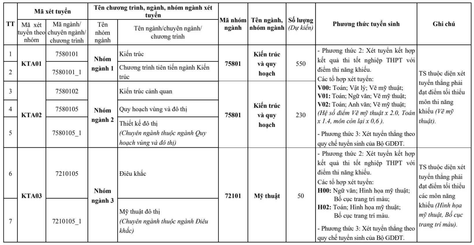 Áp dụng đối với các ngành/chuyên ngành năng khiếu có tổ hợp xét tuyển V00, V01, V02, H00, H02; kết hợp điểm môn thi trong kỳ thi tốt nghiệp THPT năm 2026 và điểm môn thi năng khiếu do Trường Đại học Kiến trúc Hà Nội tổ chức năm 2026.