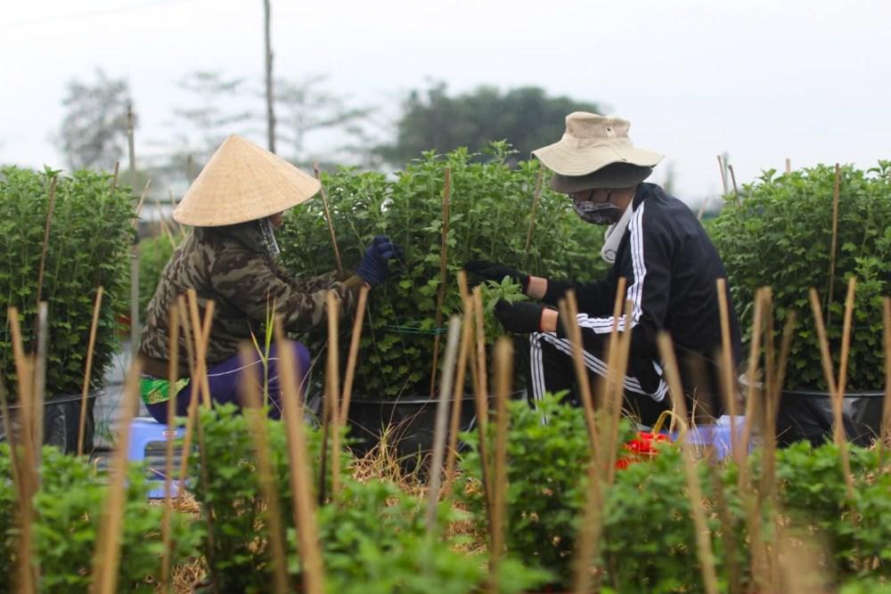 Hiện tại, các nhà vườn đang gấp rút các công đoạn chăm sóc để cho hoa nở đúng dịp Tết. Các loại hoa được trồng phổ biến tại đây bao gồm cúc đại đóa, cúc pha lê, hướng dương, cát tường... Tất cả đều được chăm sóc tỉ mỉ, từ công đoạn lặt bỏ lá non đến trộn đất, bón phân, đặt chậu.