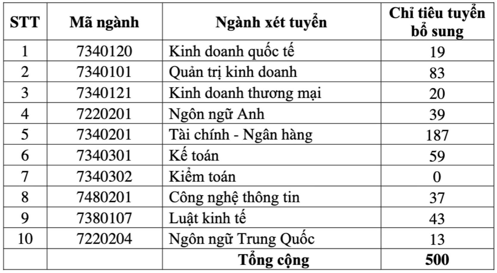 Chỉ tiêu tuyển sinh: Ngành Kinh doanh quốc tế tuyển bổ sung 19 chỉ tiêu, ngành Quản trị kinh doanh tuyển bổ sung 83 chỉ tiêu, ngành Luật Kinh tế tuyển bổ sung 43 chỉ tiêu...