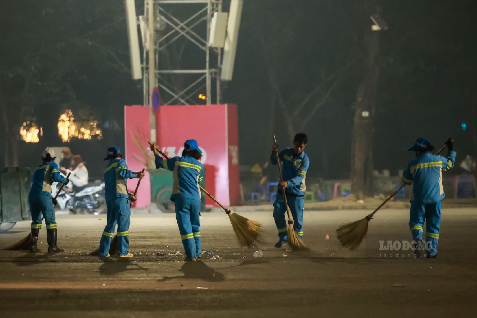 0h30 sáng ngày 17.2 (tức mùng 1 Tết), dòng người rời khu vực Sân vận động Mỹ Đình sau khi xem pháo hoa, cũng là lúc hàng chục công nhân môi trường bắt đầu ca làm việc bận rộn nhất trong năm.