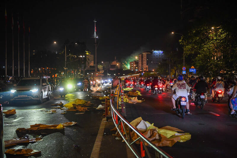 Theo ghi nhận của Lao Động, đến khoảng 1h15, mặt đường, nền gạch vỉa hè... quanh khu vực người dân xem bắn pháo hoa đã gọn gàng, sạch sẽ.