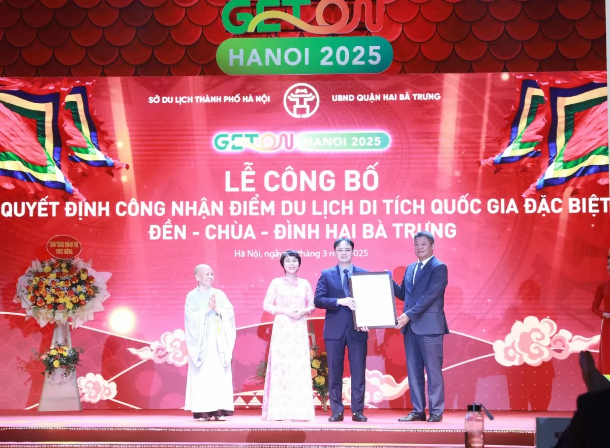 Tối 4/3, Sở Du lịch thành phố Hà Nội và quận Hai Bà Trưng tổ chức chương trình Du lịch Hà Nội chào 2025 - Geton Hanoi 2025 và công bố Quyết định công nhận điểm du lịch Cụm di tích Quốc gia đặc biệt đền-chùa - đình Hai Bà Trưng.