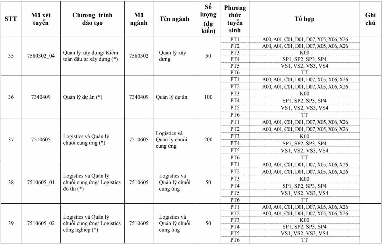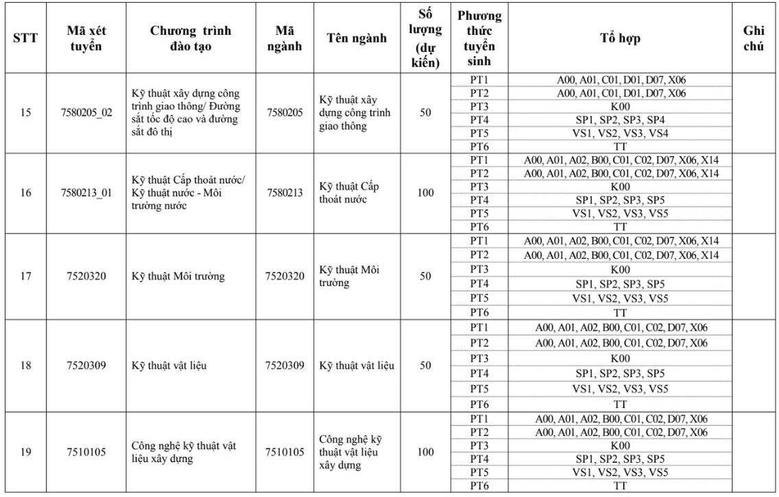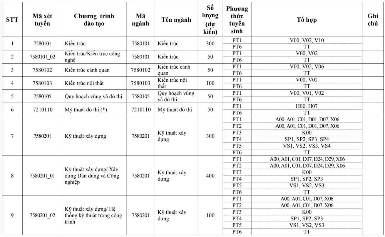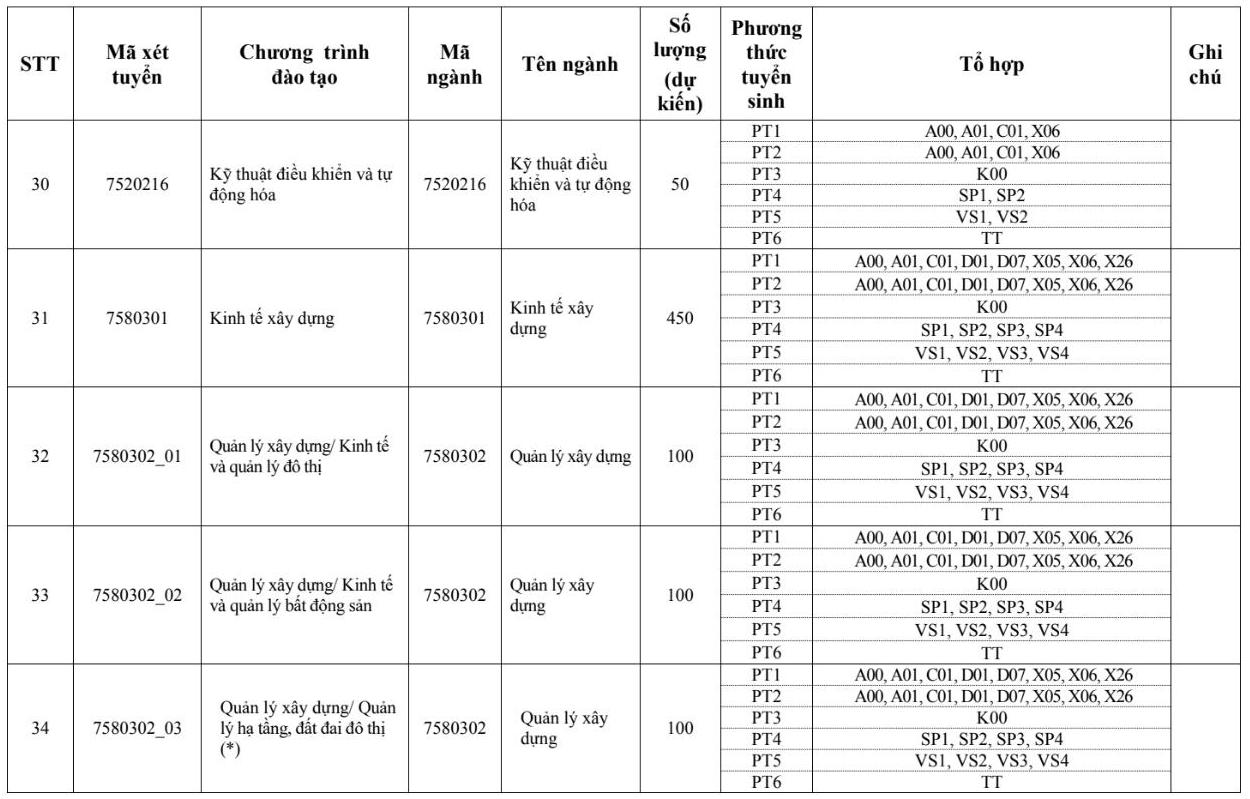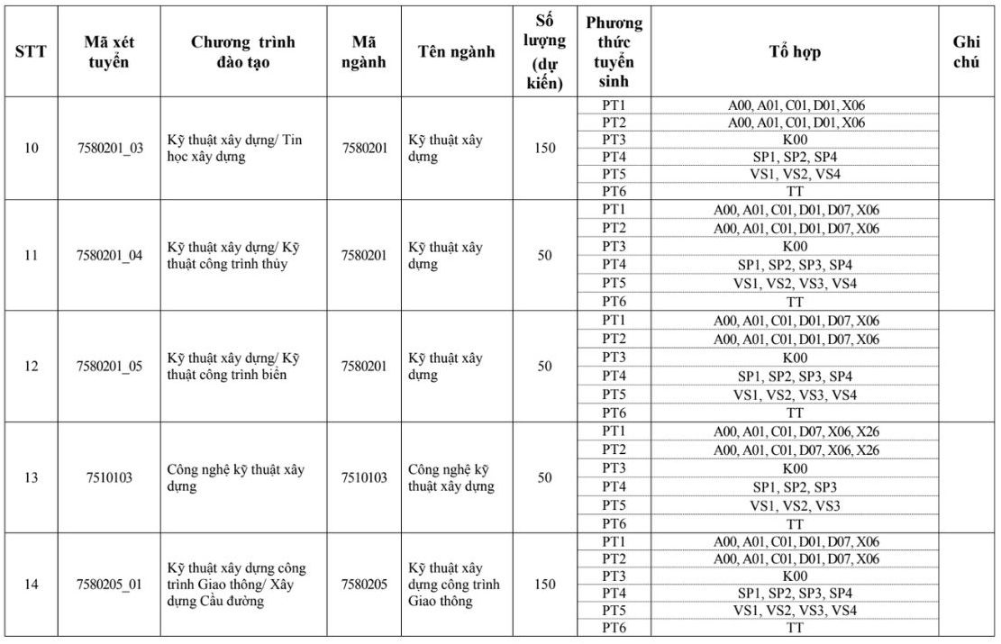 Các ngành đào tạo xét tuyển bằng tổ hợp D01 như sau: Kỹ thuật xây dựng, Kỹ thuật xây dựng/Tin học xây dựng, Kinh tế xây dựng, Công nghệ thông tin, Khoa học máy tính, Khoa học dữ liệu, Quản lý dự án, Quản lý xây dựng/Kinh tế và quản lý bất động sản...