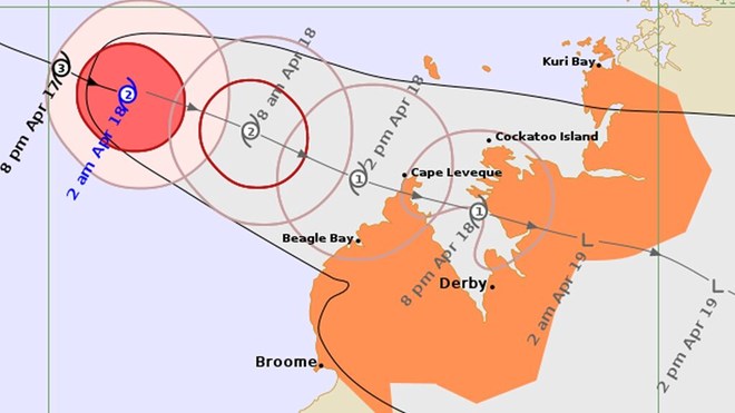 Cơ quan thời tiết Australia dự báo, cơn bão này sẽ suy yếu xuống dưới cấp nhiệt đới khi đi qua bờ biển phía tây Kimberley vào tối 18.4, nhiều khả năng sẽ đi qua Mũi Leveque và Đảo Cockatoo.
