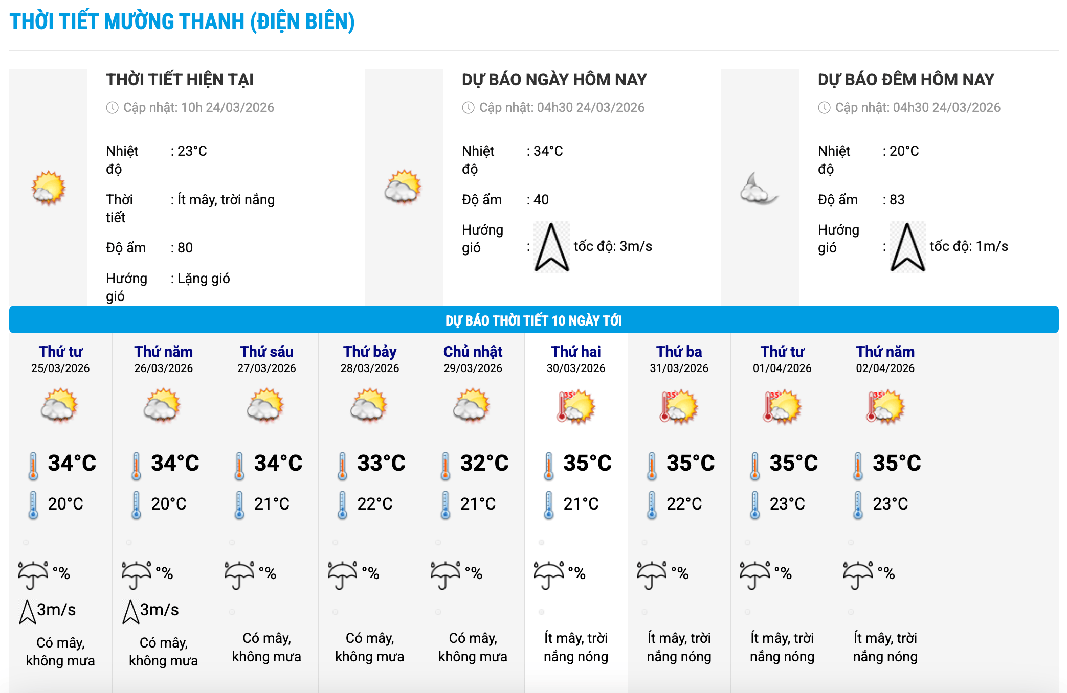Khu vực Bắc Bộ và khu vực từ Thanh Hóa đến thành phố Huế từ ngày 24.3 đến ngày 27.3, dự báo có mưa vài nơi, sáng sớm có sương mù và sương mù nhẹ rải rác, trưa chiều trời nắng.
