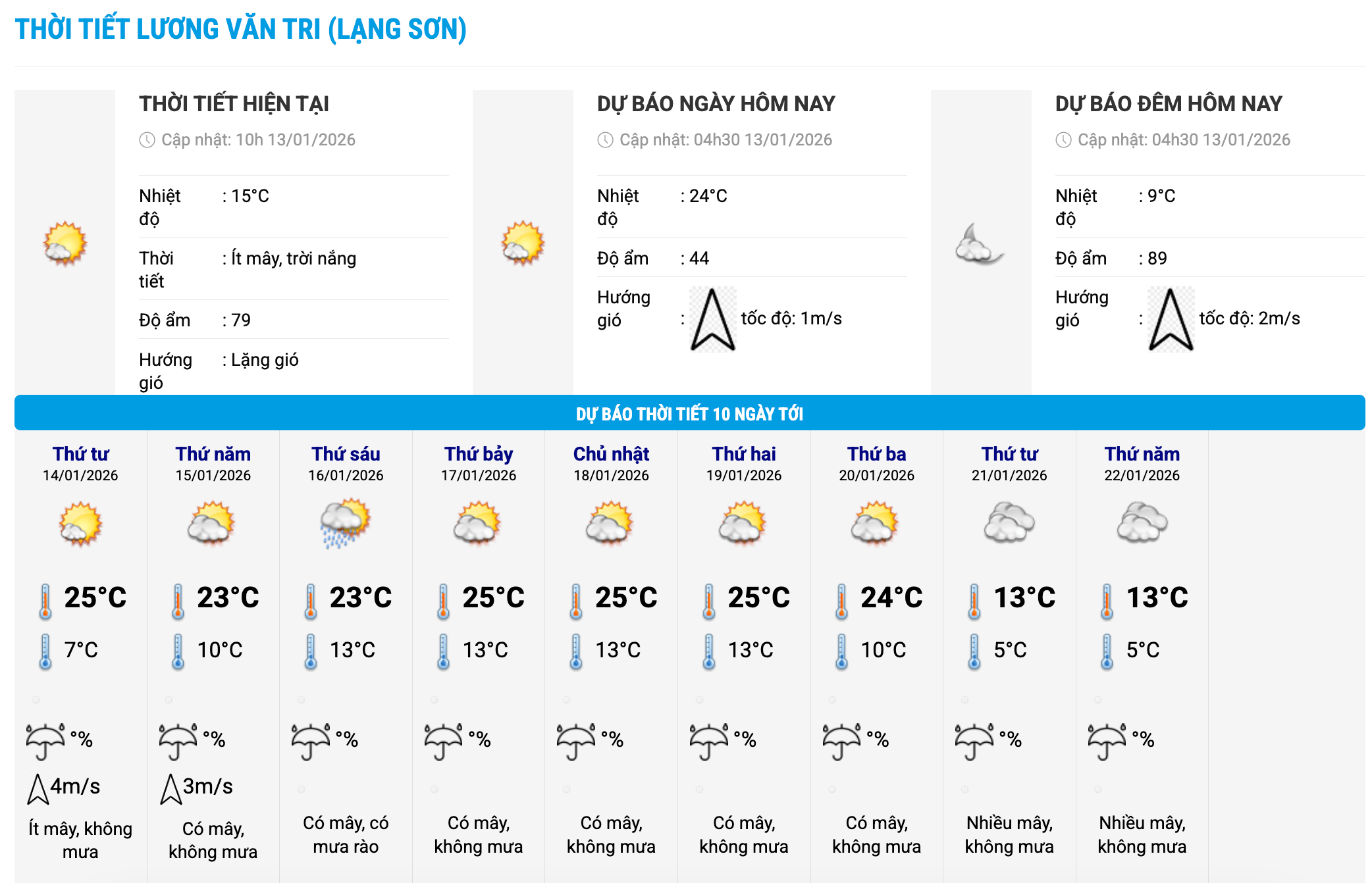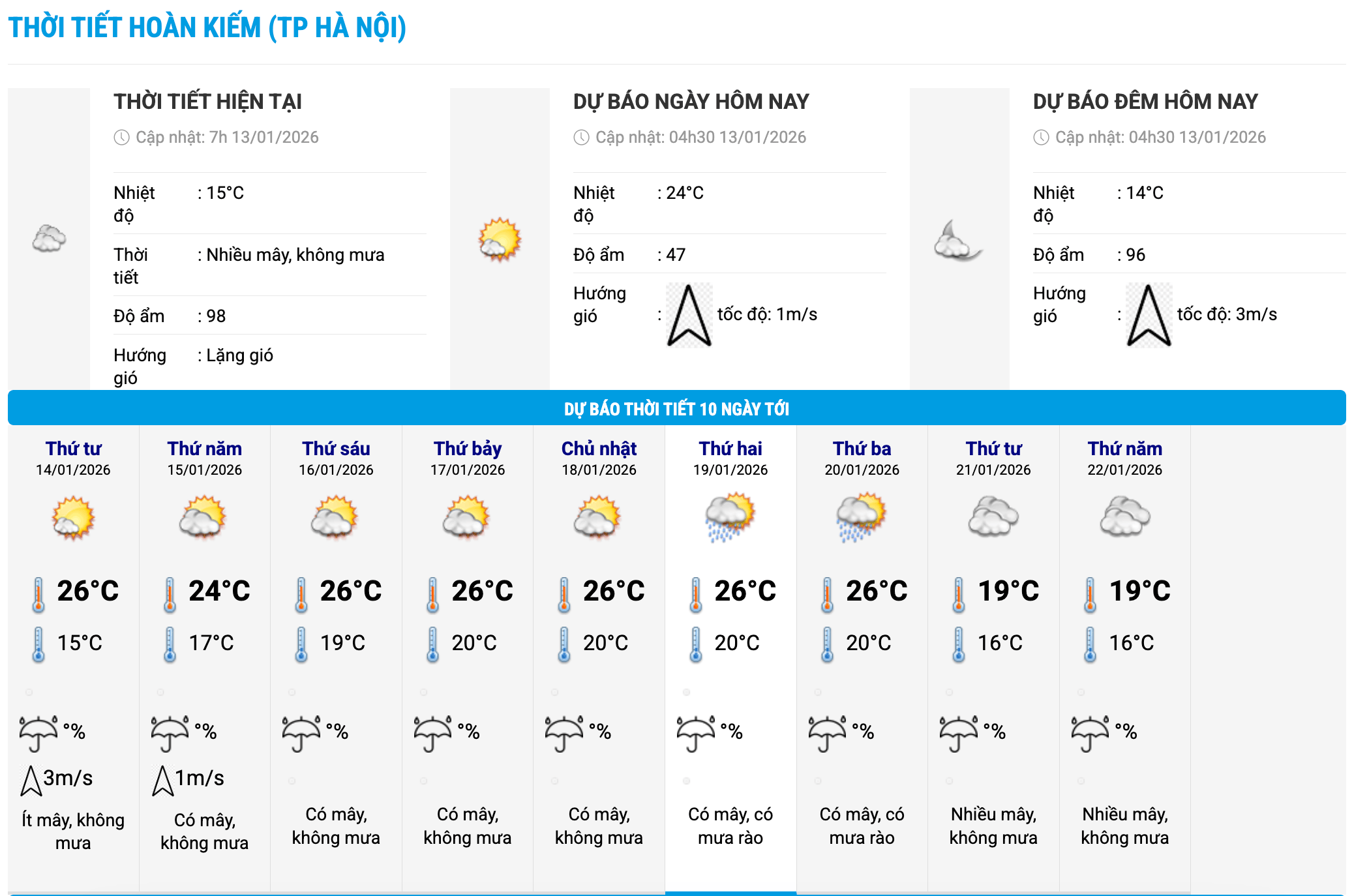 Về diễn biến thời tiết sắp tới, theo cơ quan khí tượng, từ ngày 13 - 20.1, khu vực Bắc Bộ và Bắc Trung Bộ duy trì thời tiết có mưa vài nơi, sáng sớm có sương mù và sương mù nhẹ rải rác, trưa chiều trời nắng. Đêm và sáng trời rét, vùng núi có nơi rét đậm.