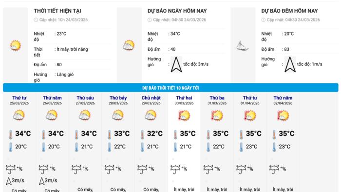 Dự báo thời tiết khu vực này có mây, chiều tối và đêm có mưa rào và dông vài nơi, ngày nắng nóng, gió nhẹ. Trong mưa dông có khả năng xảy ra lốc, sét, mưa đá và gió giật mạnh.