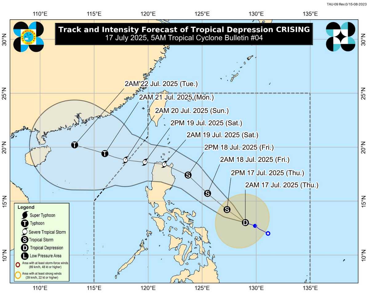 Tin bão mới nhất của Cục Quản lý Thiên văn, Địa vật lý và Khí quyển Philippines (PAGASA) cho hay, vào hồi 4h ngày 17.7, vị trí tâm áp thấp nhiệt đới Crising ở vào khoảng 13,1 độ vĩ bắc, 128,9 độ kinh đông, cách Juban, Sorsogon, Philippines khoảng 535km về phía đông.