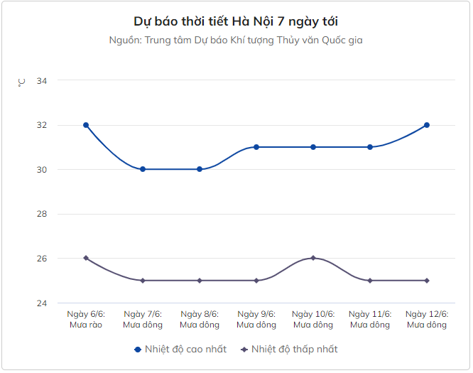 Bản đồ dự báo cho thấy trong vòng 7 ngày tới (6-12/6), Hà Nội duy trì mức nhiệt 27-32 độ C, thời tiết dễ chịu hơn khi nhiệt độ giảm. Dù vậy, mưa dông xuất hiện liên tục trong tuần này kèm nguy cơ đi kèm lốc, sét và gió mạnh.