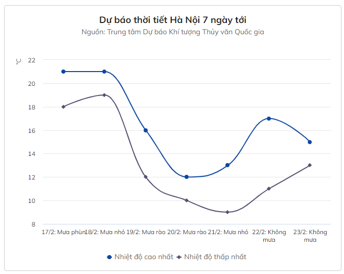 Những ngày tiếp theo, không khí lạnh xâm nhập sâu vào đất liền khiến nền nhiệt tại Hà Nội tiếp tục xuống thấp và có thể đạt ngưỡng 8-9 độ C kèm mưa. Ban ngày, nhiệt độ cao nhất không quá 10 độ C, rét nhất kể từ đầu mùa đông. Trạng thái này được dự báo kéo dài liên tục từ ngày 19 đến 21/2.