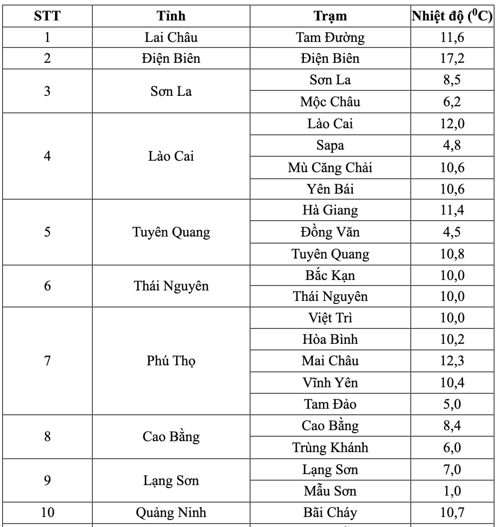 Khu vực trung du và đồng bằng Bắc Bộ phổ biến 9 - 11 độ C, Hà Đông (Hà Nội) 10,3 độ C, Bắc Ninh và Hưng Yên cùng 10 độ C.