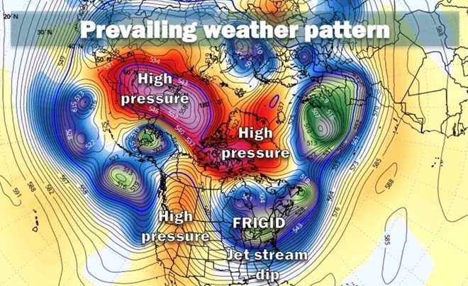 Cùng lúc, các hệ thống áp cao tại Siberia và phía tây Bắc Mỹ phối hợp với nhau, dẫn luồng không khí lạnh từ Siberia qua vùng cực, rồi theo dòng tia tràn xuống miền đông Bắc Mỹ.