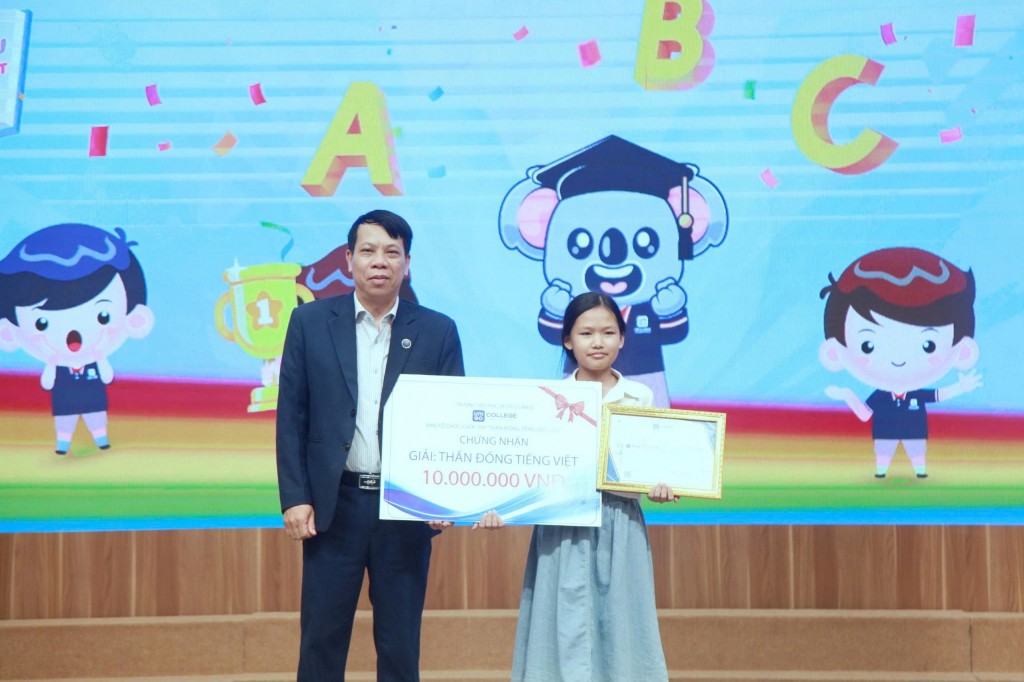 Thầy Nguyễn Hữu Việt, Hiệu trưởng trường Tiểu học và THCS Unigo trao giải Thần Đồng Tiếng Việt cho thí sinh Hoàng Đinh Thiên An, học sinh Trường Tiểu học Lê Quý Đôn |