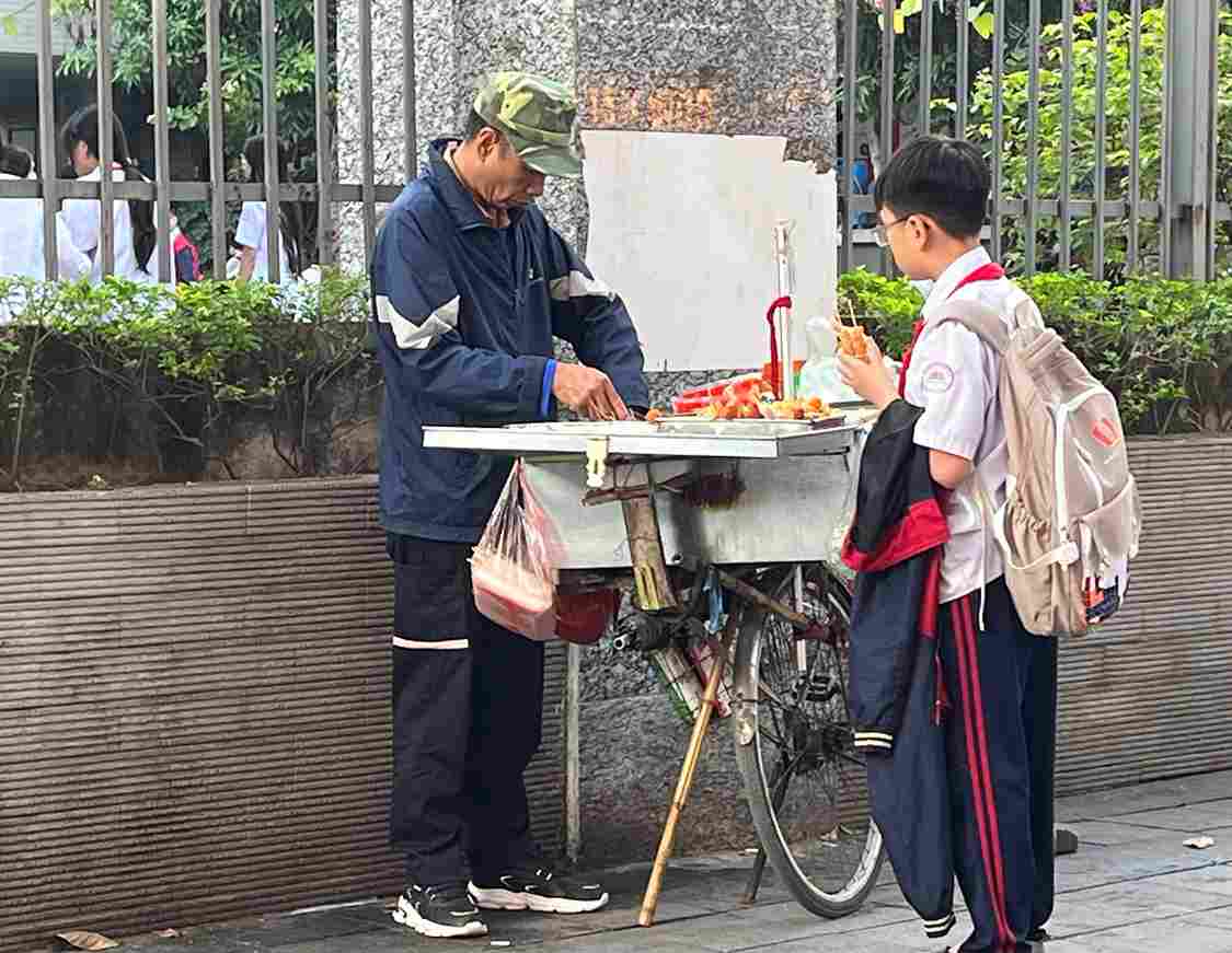 Không khó để bắt gặp cảnh các hàng rong bày bán “xiên bẩn” ngay sát cổng trường, cạnh cống thoát nước, bãi rác tạm hay ven những tuyến đường xe cộ đông đúc. Thực phẩm được đặt trực tiếp trên khay nhựa, không che chắn, phơi mình giữa khói bụi, ruồi nhặng và mùi dầu mỡ nồng nặc.