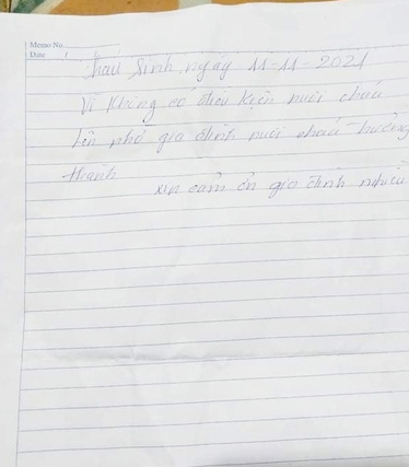 Người viết bức thư trình bày: "Vì điều kiện hoàn cảnh sinh ra cháu nhưng ốm đau bệnh tật, không có khả năng nuôi cháu, nên gửi cháu cho cha mẹ nào đón cháu nuôi giúp. Cháu sinh ngày 14/9 (19/8/2022 âm lịch)". Sau thời gian thông báo, nếu cha mẹ cháu không đến nhận con, chính quyền địa phương sẽ tiến hành làm thủ tục đăng ký khai sinh và các thủ tục khác liên quan đến việc cho, nhận con nuôi theo quy định của pháp luật.