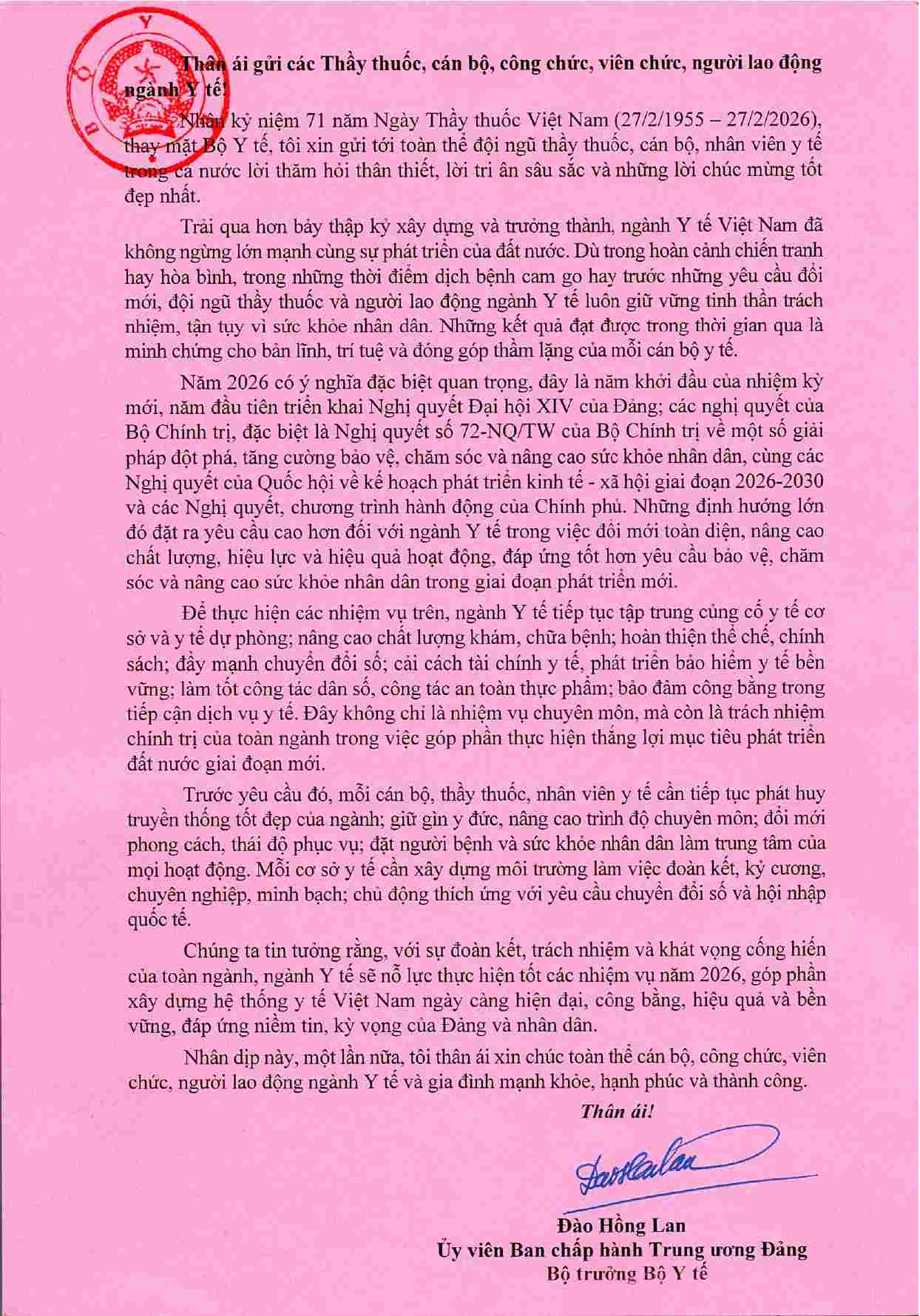 Bộ trưởng Bộ Y tế Đào Hồng Lan vừa có thư gửi cán bộ ngành y tế nhân kỷ niệm 71 năm Ngày Thầy thuốc Việt Nam (27.2.1955 - 27.2.2026).