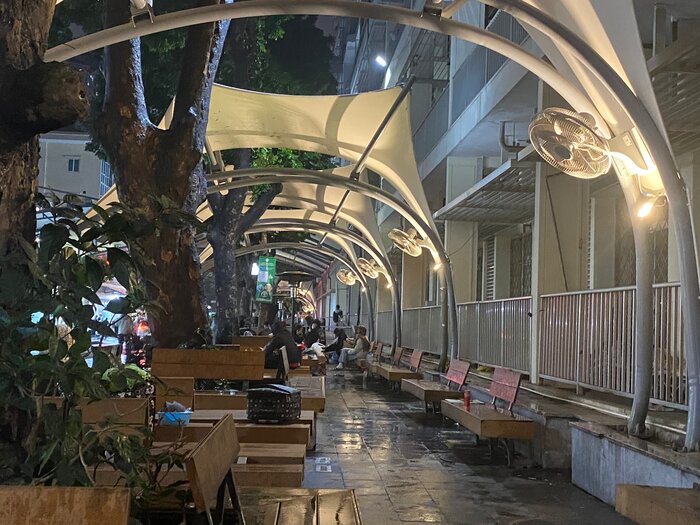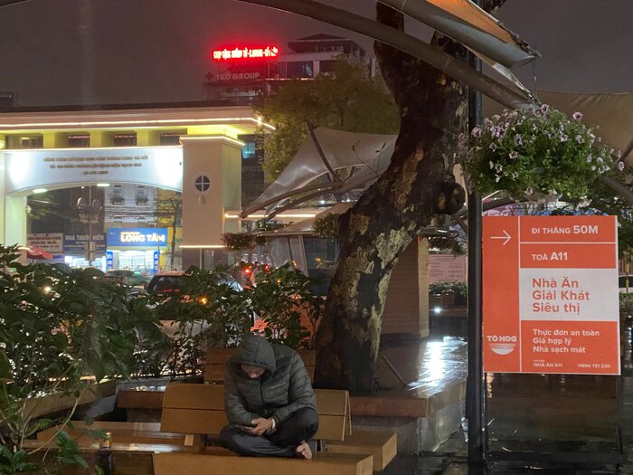 Nhiều người tranh thủ ngủ ở bất cứ đâu có thể. Người thì co ro trên ghế đá dưới mái che, người tìm chỗ khuất gió như gầm cầu đi bộ. Khi trời mưa, ai nấy lại vội vã chạy khắp nơi tìm chỗ trú. Tôi may mắn lắm mới có được chỗ nằm ở khu vực sảnh có mái che, đỡ gió. Những người đến sau còn vất vả hơn nhiều", bà Hồng nói.
